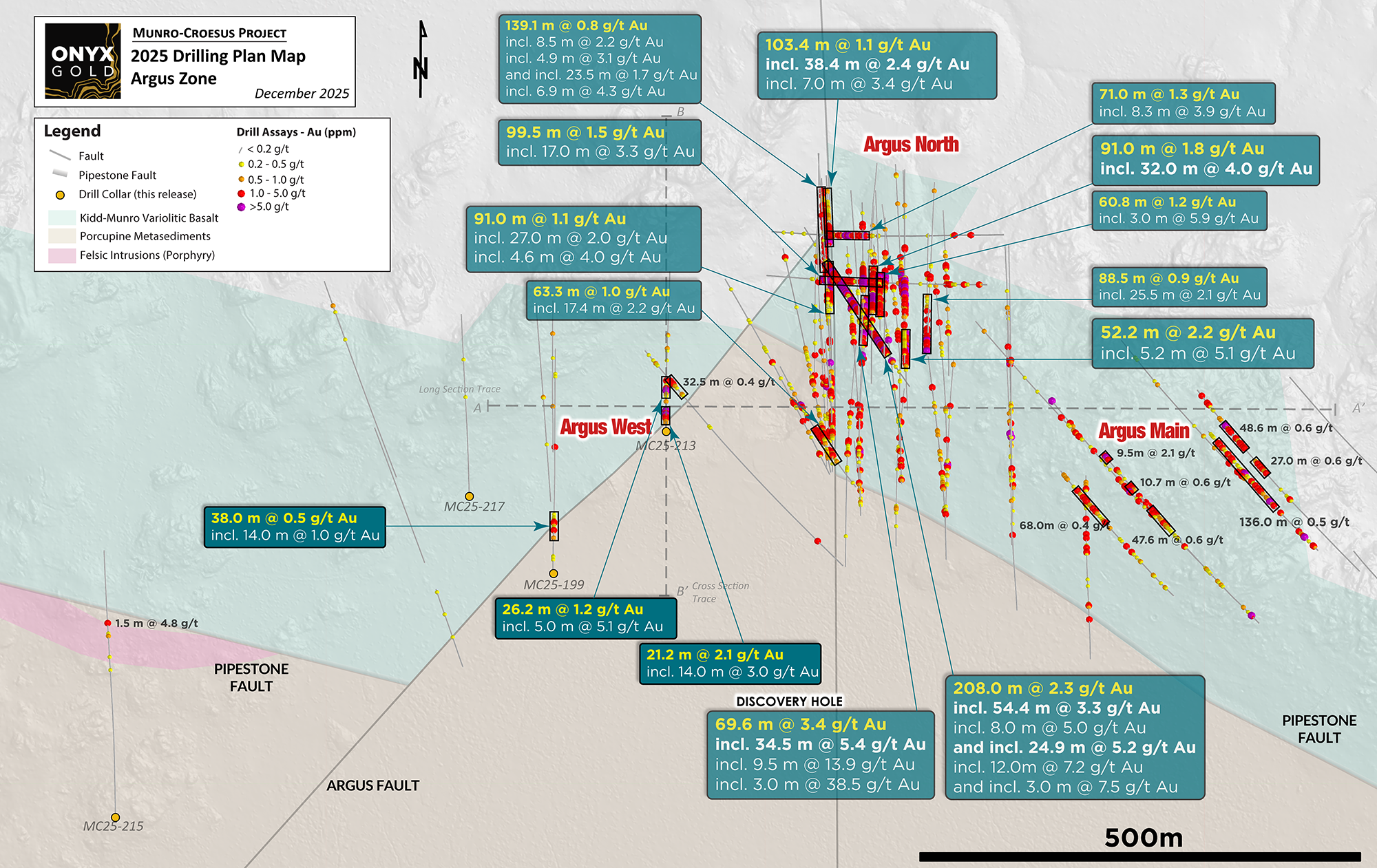 Vancouver, BC – December 3rd, 2025 – Onyx Gold Corp. (“Onyx” or the “Company“) (TSX-V: ONYX, OTCQX: ONXGF) is pleased to the announce the discovery of a new zone of near-surface gold mineralization, 250 meters (“m”) southwest of the Argus North Zone (“Argus North”). This new discovery the latest advancement of the Company’s ongoing 75,000 m phase I/II/III diamond drill program (the “Program”) at its 100%-owned Munro-Croesus Project (“Munro-Croesus” or the “Project”), located 75 km east of Timmins, Ontario.
