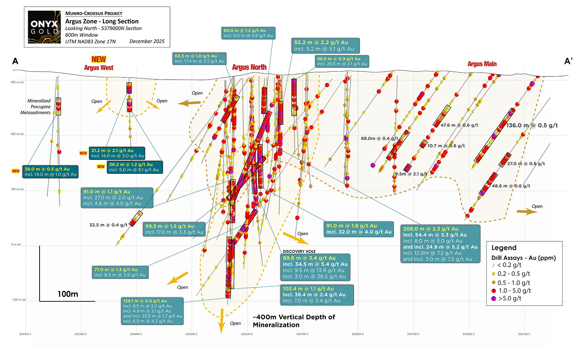 - Ongoing step-out drilling at the Argus North, Main and West discoveries has now defined broad zones of gold mineralization over a total strike length of 900 m and from surface to ~400 m vertically.