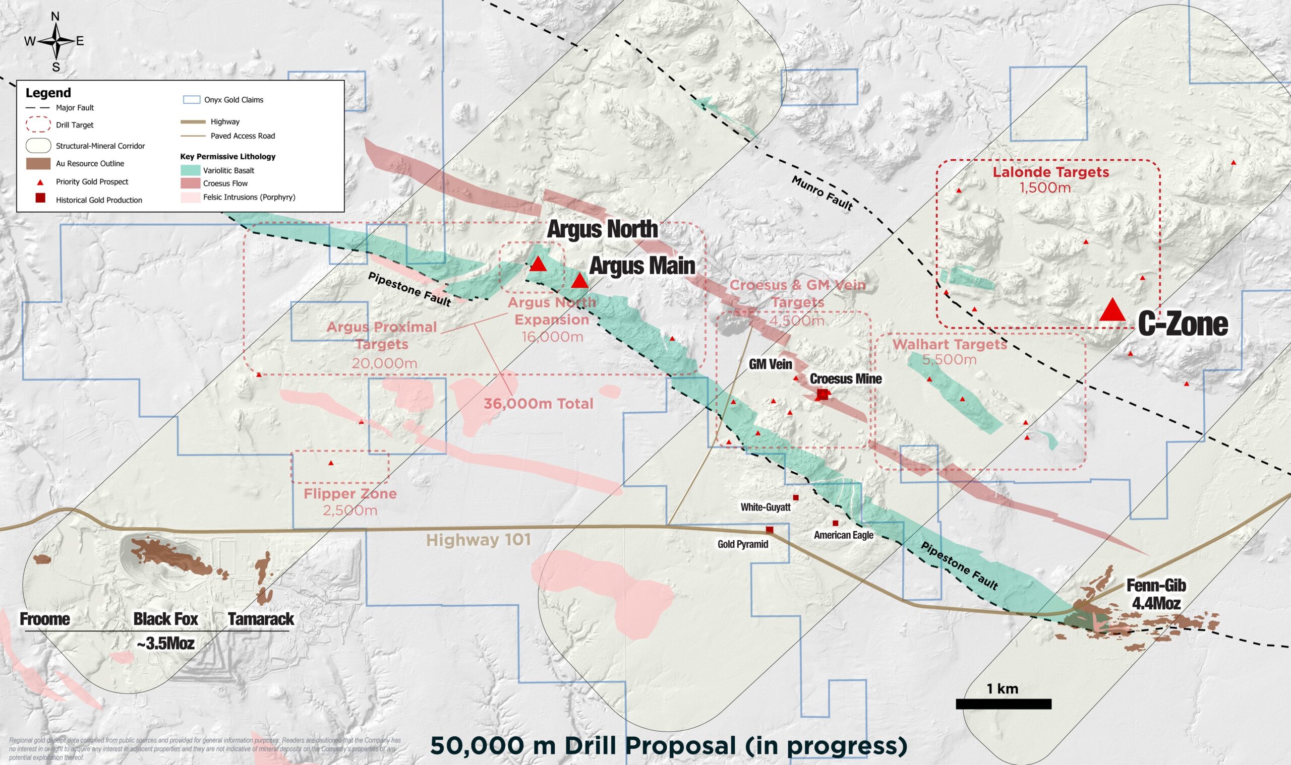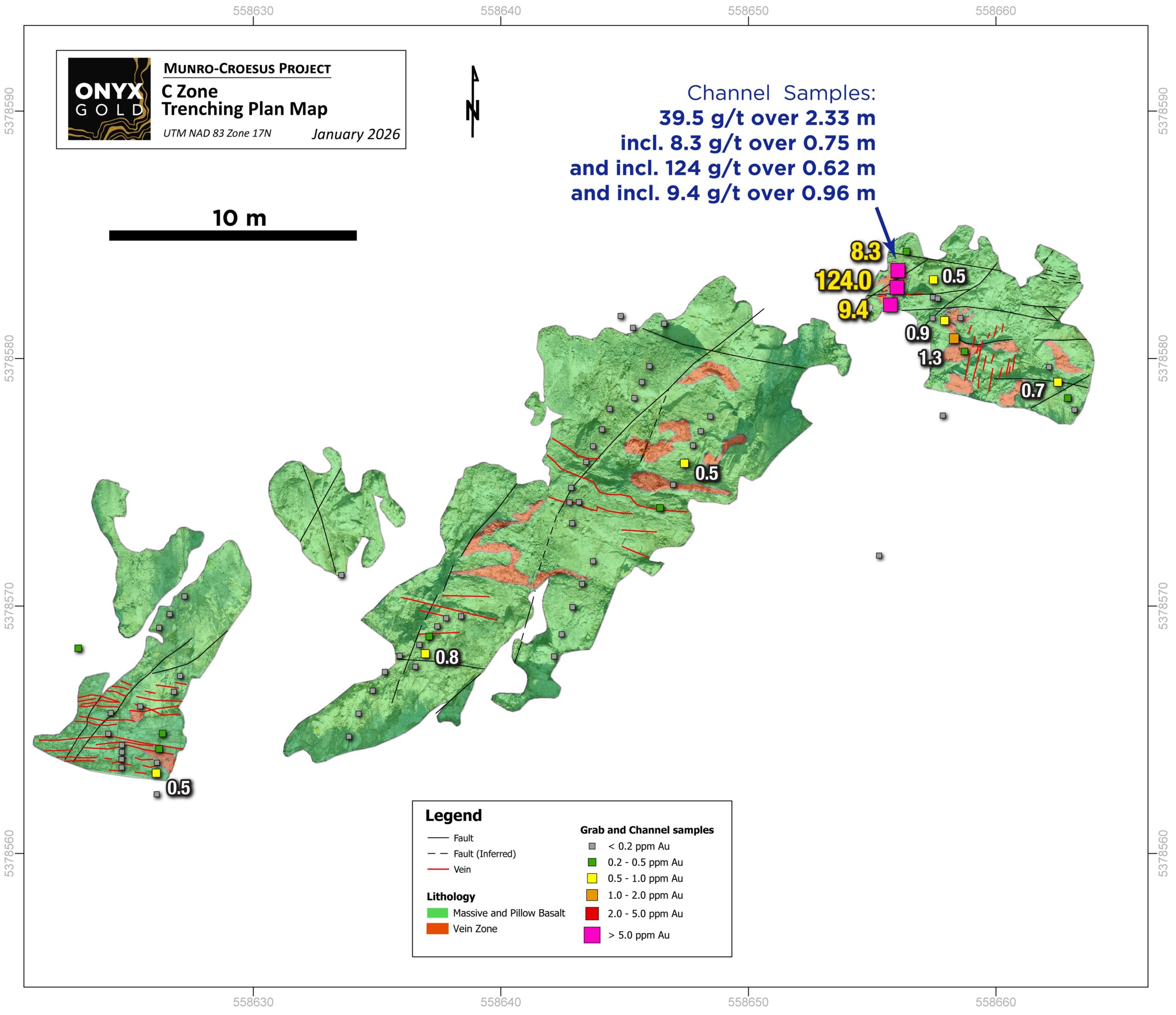 Results reported today include those from surface channel samples collected at the C Zone, a regional target situated six kilometers (“km”) east of the Argus North discovery and three km northeast of the historic Croesus Gold Mine. The target was identified by Onyx’s exploration team as a prospect with possible similarities and host setting to the high-grade Croesus Vein. Trenching at the C Zone began in Fall 2025 and subsequent sampling returned very encouraging gold grades with values up to 124 grams per tonne gold (“g/t Au”) over 0.62 meters (“m”).